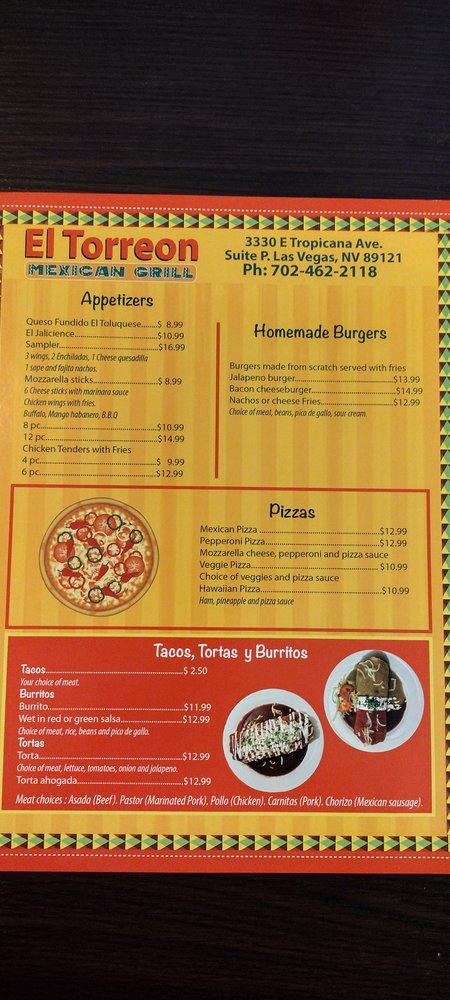 Welcome to El Torreon Mexican Grill, the latest gem in Las Vegas where authentic Mexican flavors meet a lively dining atmosphere. Nestled at 3330 E Tropicana Ave, this grill offers a tantalizing menu featuring traditional favorites like Enchiladas Michoanas ($15.99), Tacos ($2.75), and generous Burritos ($13.99). With a vibrant selection of meats and salsas, there's something to satisfy every palate.